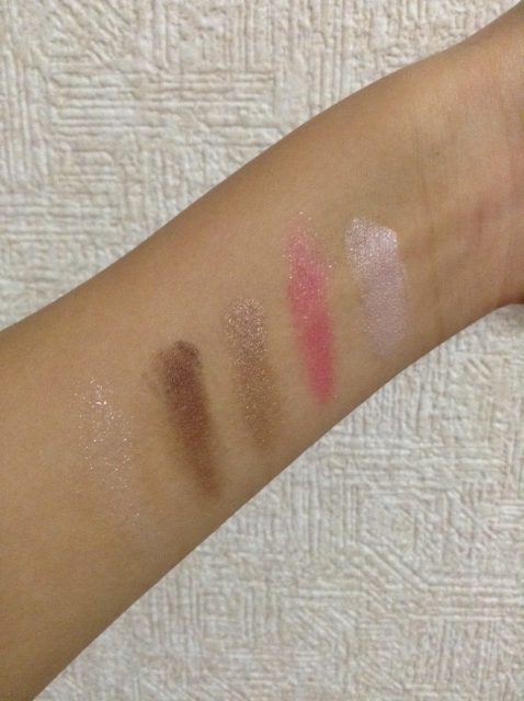 (上の写真は、指に少し取って腕につけたものです。色の順番は、パレットの左上・左下・右上・右下・真ん中です。)